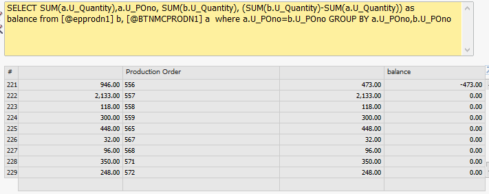 SELECT SUM(a.U_Quantity),a.U_POno, SUM(b.U_Quantity), (SUM(b.U_Quantity)-SUM(a.U_Quantity)) as balance from [@epprodn1] b, [@BTNMCPRODN1] a where a.U_POno=b.U_POno GROUP BY a.U_POno,b.U_POno