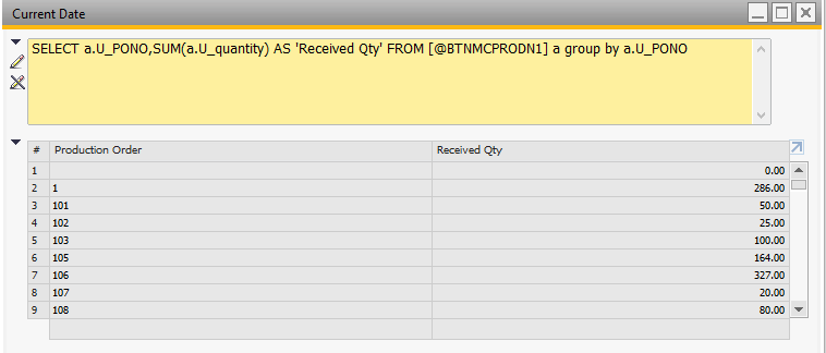 Example : SELECT a.U_PONO,SUM(a.U_quantity) AS ‘Received Qty’ FROM [@BTNMCPRODN1] a group by a.U_PONO