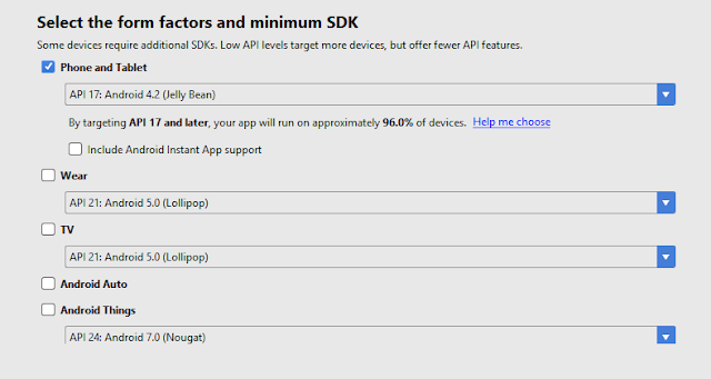 ধরলাম আমরা Phone and Tablet এর জন্য এপ্লিকেশন বানাবো । এখন Minimum SDK থেকে আমাদের এপ্লিকেশন অ্যায়ন্ড্রোয়েড এর সর্বনিম্ন কোন ভার্সন পর্যন্ত সাপোর্ট করার অনুমতি দিব তা নির্ধারণ করে দিব। এখানে Help me choose ক্লিক করলেই কোন ভার্সন পৃথিবীর কত ভাগ মোবাইলে ব্যাবহার হচ্ছে তার শতকরা হিসাব দেখতে পাবেন এবং কোন ভার্সনে Android এ কি কি ফিচার যুক্ত হয়েছে তার বর্ণনাও দেয়া আছে । আর একটি কথা আমরা নিশ্চয়ই জানি প্রতিটা ভার্সনের জন্য একটি এপিআই নাম্বার থাকে , যত ভার্সন অ্যানন্ড্রোয়েট আপডেট করে এপিআই নাম্বার তত বাড়তে থাকে । ধ্রুন আপনি মিনিমাম এপিআই লেভেল ১৭ সিলেক্ট করলেন তাহলে আপনার তৈরি এপ্লিকেশন এপিআই লেভেল ১৮-১৯-২০ এও সাপোর্ট করবে কিন্তু এপিআই লেভেল ১৬ তে আপনার এপ্লিকেশন সাপোর্ট করবে নাহ। তাহলে আপনি নিশ্চয়ই চাইবেন একদম সর্বনিম্ন এপিআই লেভেল দিয়ে রাখতে কিন্তু সেখানে আবার সমস্যা হল আপগ্রেড ভার্সন গুলোর অনেক ফিচার এর কোড লেখার সময় সাপোর্ট লাইব্রেরী যুক্ত করা সহ অনেক ঝামেলায় পড়তে হয় । তাই আপনি আপনার এপ্লিকেশন এ কিরকম ফিচার ব্যাবহার করবেন এবং আপনার টার্গেট ইউজার কারা সেই মাফিক এপিআই লেভেল সিলেক্ট করবেন । তবে চিন্তার কোন কারন নেই চাইলে পরে আবার এটি যতবার খুশি চেঞ্জ করতে পারবেন । ধরলাম আমরা এপিআই লেভেল ১৭ সিলেক্ট করলাম ।